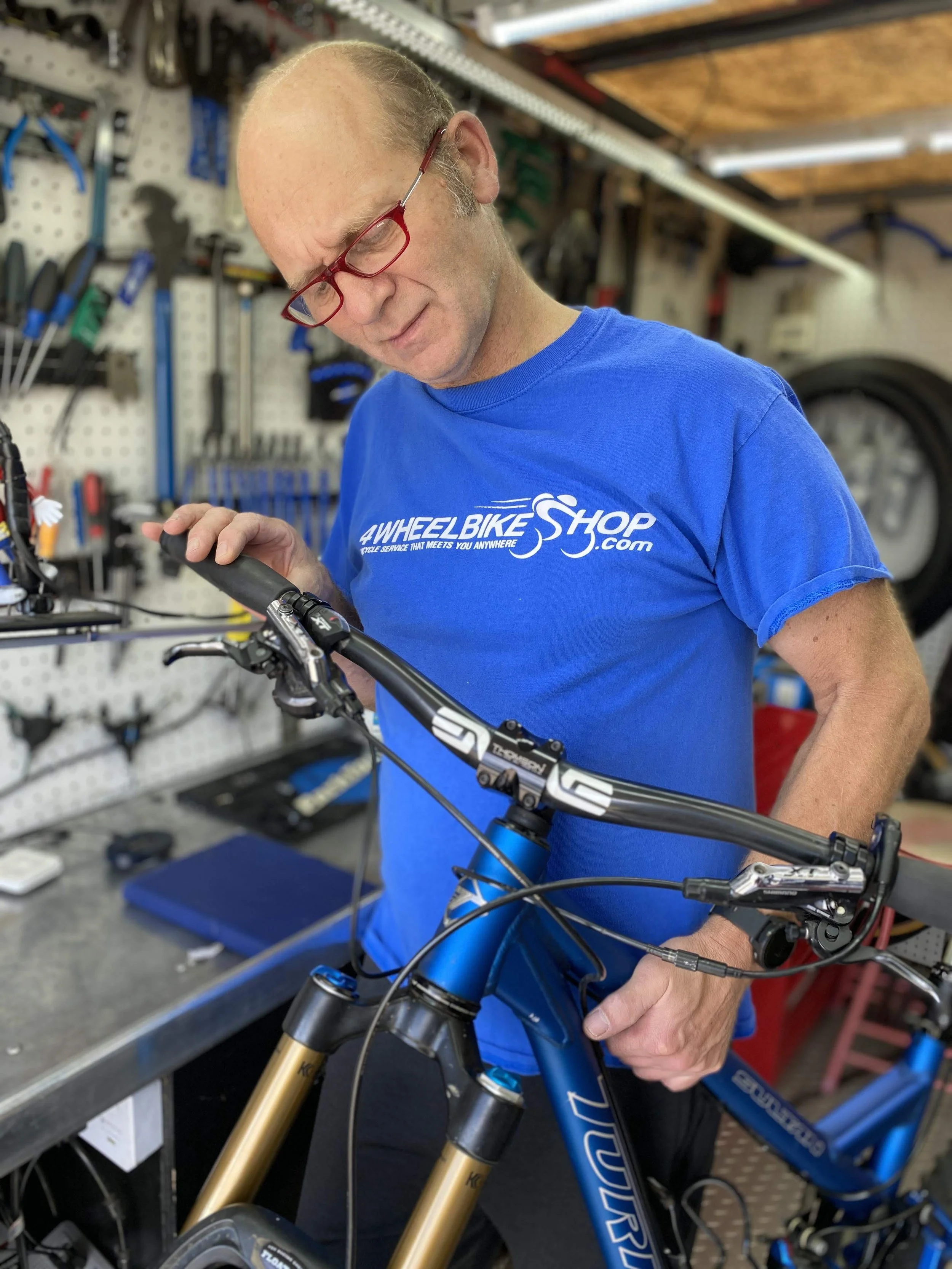4WheelBikeShop owner and lead mechanic Rick Beasley wants you to know that he’s got you and your bicycle covered—no matter where you are! 4WheelBikeShop is a mobile bike repair company dedicated to providing friendly service, expert care and unbeatable convenience. We’ll meet you at home, the office, the park or wherever works for you with our fully equipped shop on wheels ready to get your bicycle in perfect running order. Local bike shops sometimes require weeks to complete their services. In most cases, 4WheelBikeShop will have it done for you within hours, so you never have to be without your bicycle for very long. You’ll be rolling in no time thanks to Rick, a professional bike mechanic and cycling expert, and the rest of the team here at 4WheelBikeShop.